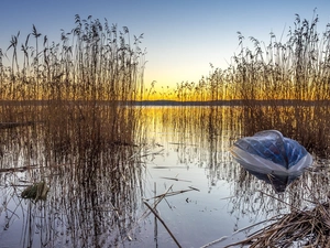 Blue, lake, Mountains, Boat