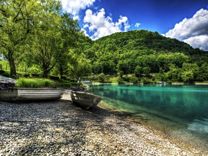 trees, viewes, Fog, Blue, Sunrise, forest, River, Boat
