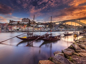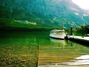 River, Mountains, clouds, Boat