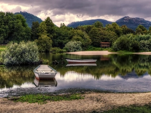 house, clouds, boats, cane, lake