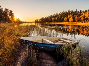 rushes, grass, Boat, Platform, lake