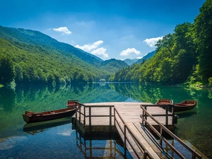 Windmills, motorboat, Rhodes Island, Mandraki Harbour, Greece