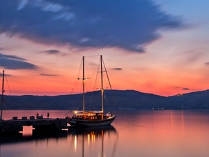 lake, mount, a man, forest, mountains, Sunrise, Kayak