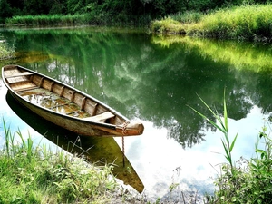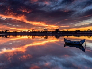 Boat, forest, clouds, lake