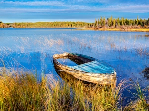 trees, light, reflection, boats, lake
