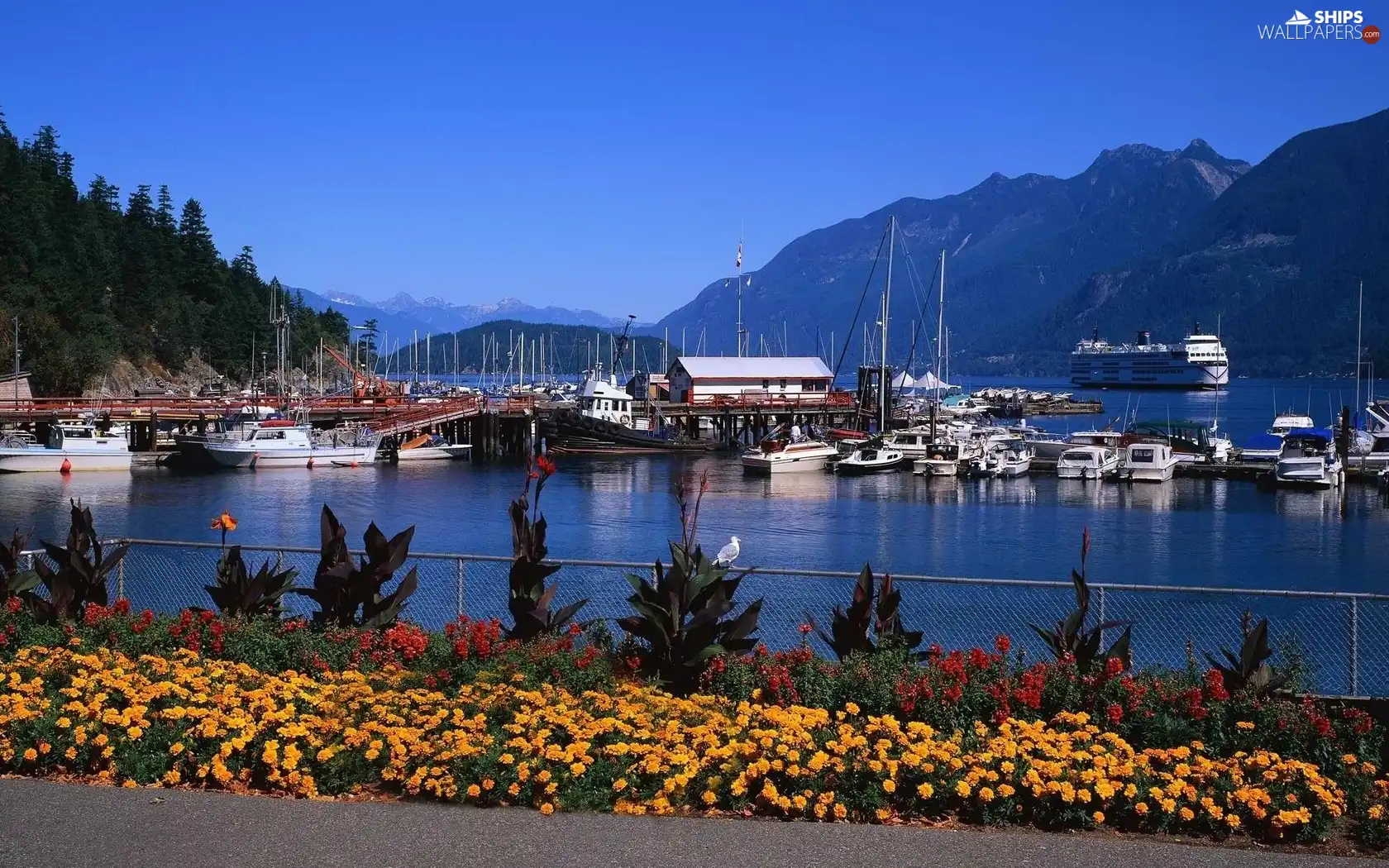 Mountains, Flowers, Ship, motorboat, port