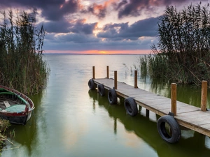 trees, viewes, rushes, Boat, grass, lake, autumn, Orange
