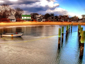 Platform, autumn, lake, Boat, clouds, Great Sunsets, trees, viewes, forest