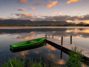 Boats, reflection, Town, River, autumn