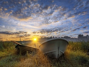Boat, lake, clouds, Trondheim City, reflection, trees, Sor Trondelag Region, forest, lake, Norway, Platform, viewes, Great Sunsets