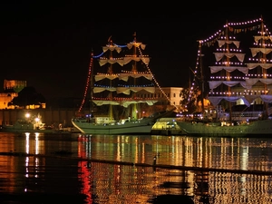 Fog, Boat, Rain, Platform, viewes, Mountains, lake, trees