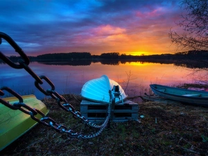 Platform, Boat, reflection, forest, viewes, lake, clouds, trees