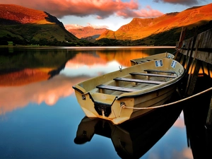 Platform, trees, Sunrise, viewes, lake, Boat, clouds