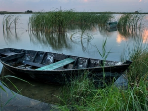 Houses, Mountains, Anglers, woods, lake, clouds, Boat